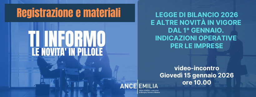 Sezione che include i materiali e la registrazione del webinar che si è tenuto in data 19 settembre 2023, nonché il Quaderno di lavoro elaborato dalla Commissione REF di ANCE EMILIA “VIA gli ostacoli dagli edifici” e i suoi allegati.
