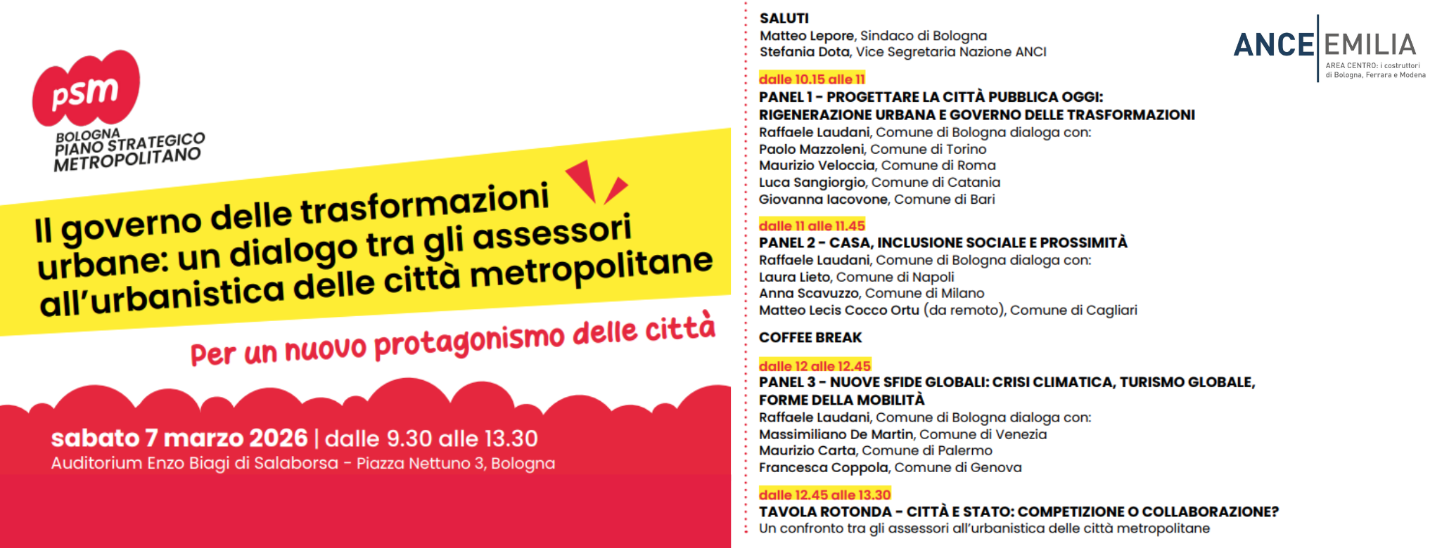 Segnaliamo ai nostri Associati che Sabato 7 marzo 2026, dalle ore 9.30 alle ore 13.30, si terrà il convegno “Il governo delle trasformazioni urbane: un  dialogo tra gli Assessori all’Urbanistica delle Città metropolitane – Per un nuovo protagonismo delle città”, presso l’Auditorium Enzo Biagi della Sala Borsa, in Piazza del Nettuno...